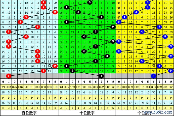 (1)在以上统计中奖,遗漏期数最多的三个号码为:5、3、0,本期展望奖号不全在这三码中;出现期数最多的四个号码为:1、7、6、9,本期展望这四个号码中至少出现1个奖号,胆码参考1。
